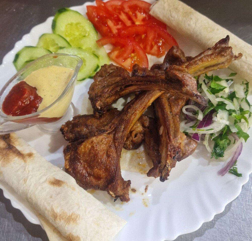 Баранина со специями, обжаренные на древесных углях, подаётся с красным и белым соусами, маринованным луком, огурцом, помидором, ловашом.
