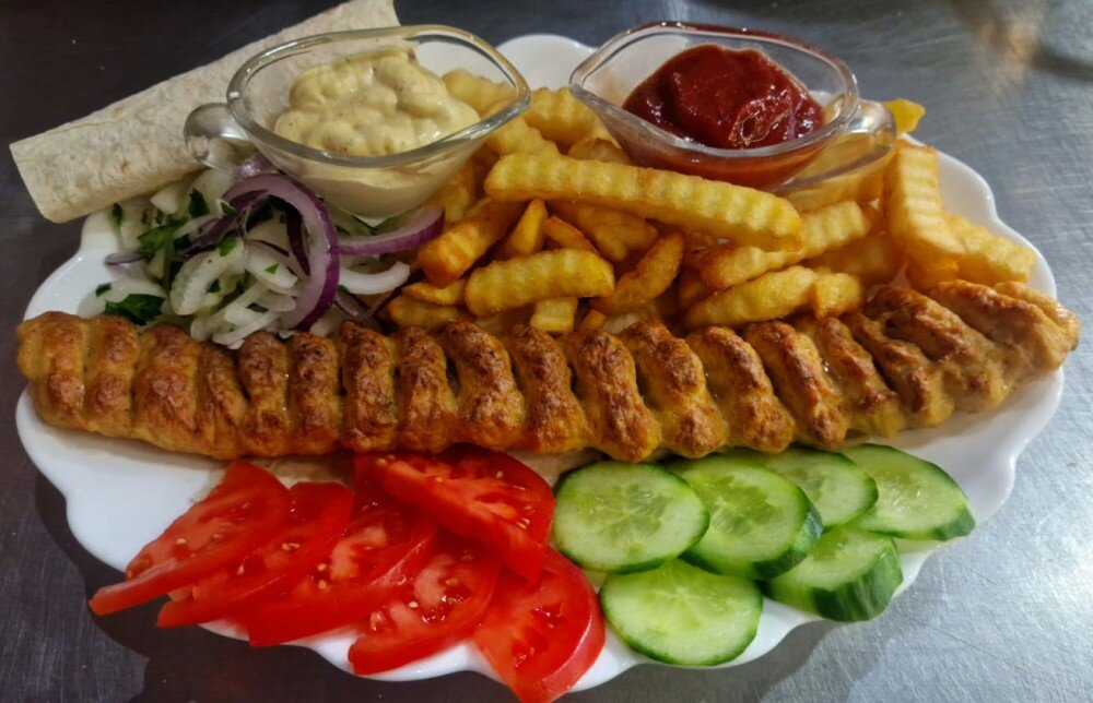 Люля курица со специями, обжаренные на древесных углях, подаётся с красным и белым соусами, маринованным луком, огурцом, помидором, ловашом и картошка фри