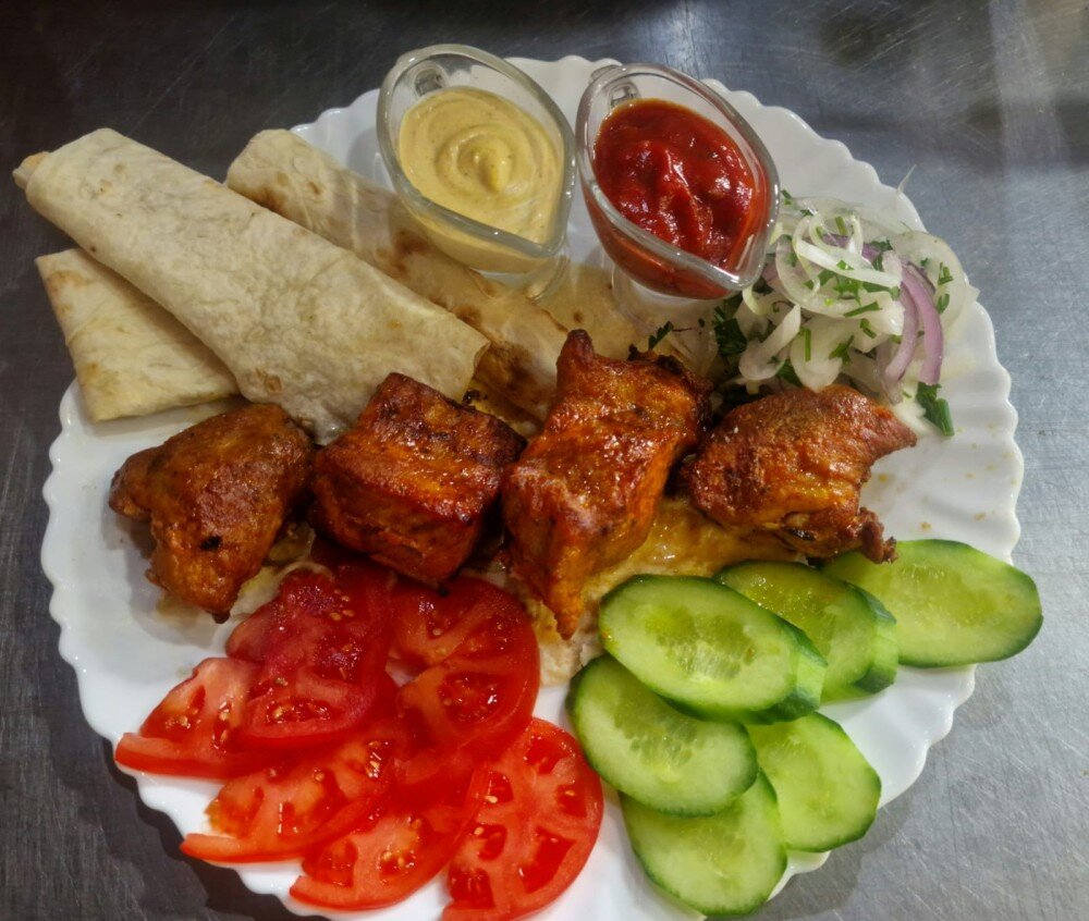 Свинина без костей со специями, обжаренные на древесных углях, подаётся с красным и белым соусами, маринованным луком, огурцом, помидором, ловашом.
