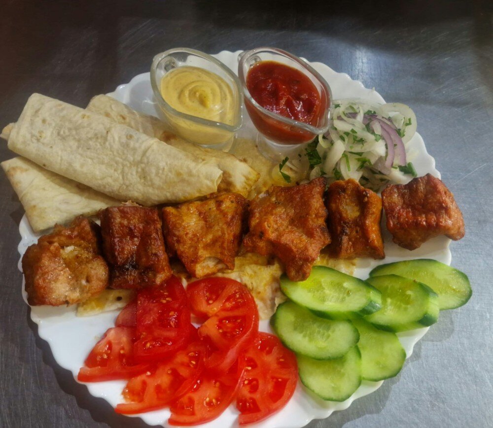 Свинина Шея со специями, обжаренные на древесных углях, подаётся с красным и белым соусами, маринованным луком, огурцом, помидором, ловашом.